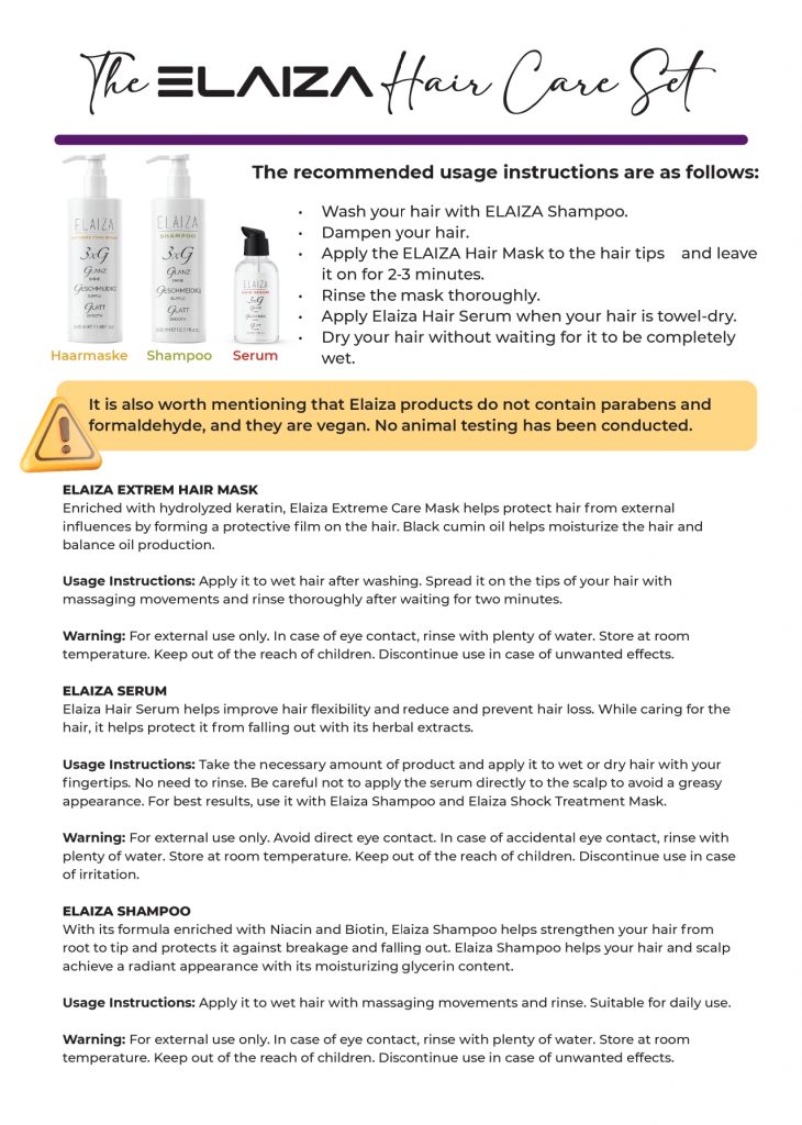 EN: Elaiza Extreme Care Hair Mask enriched with Hydrolyzed keratin helps to protect your hair from external effects by creating a protective film layer on the hair. With Black cumin oil helps to moisturize your hair and balances the sebum production. Directions: Apply to wet hair after shampooing. Spread to your hair tips with massage moves and rinse well after holding it on for two minutes.There is no waiting time for regular use, you can use it for every wash, leave it for 5 minutes for the first use.
